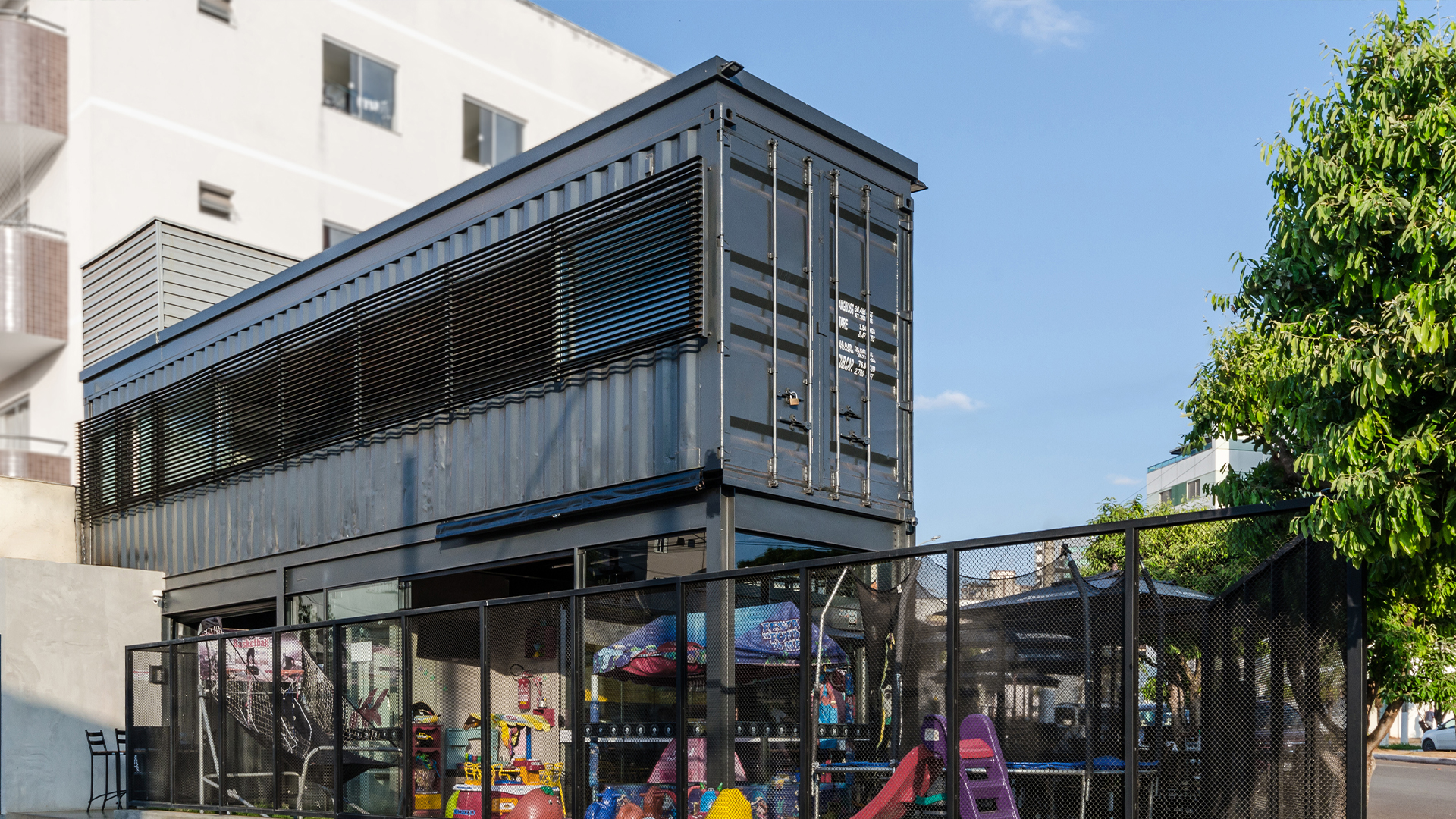 A construção foi pensada a partir de uma lógica estrutural mista composta de perfis de aço pesado — que estruturam o segundo pavimento e a cobertura deste, os módulos (containers), laje em steel deck e o sistema em alvenaria convencional.