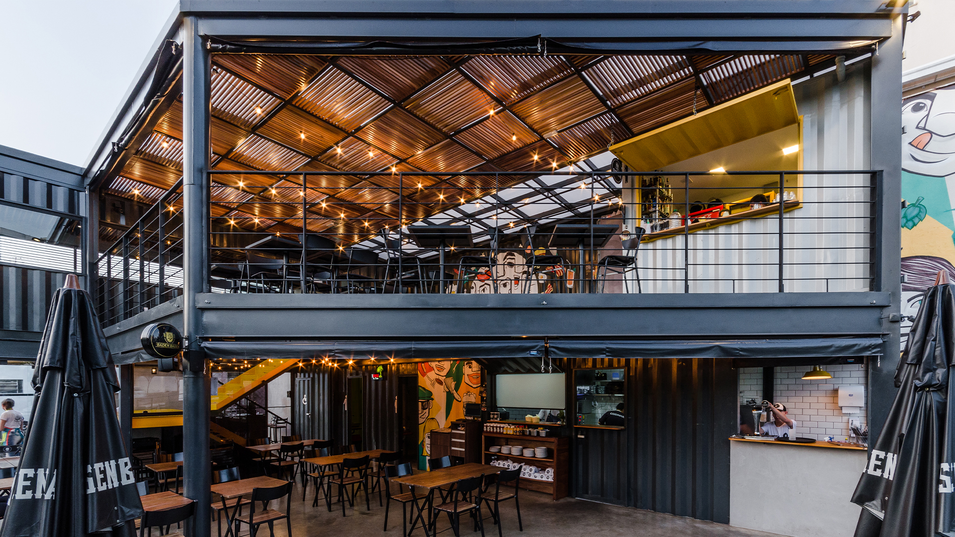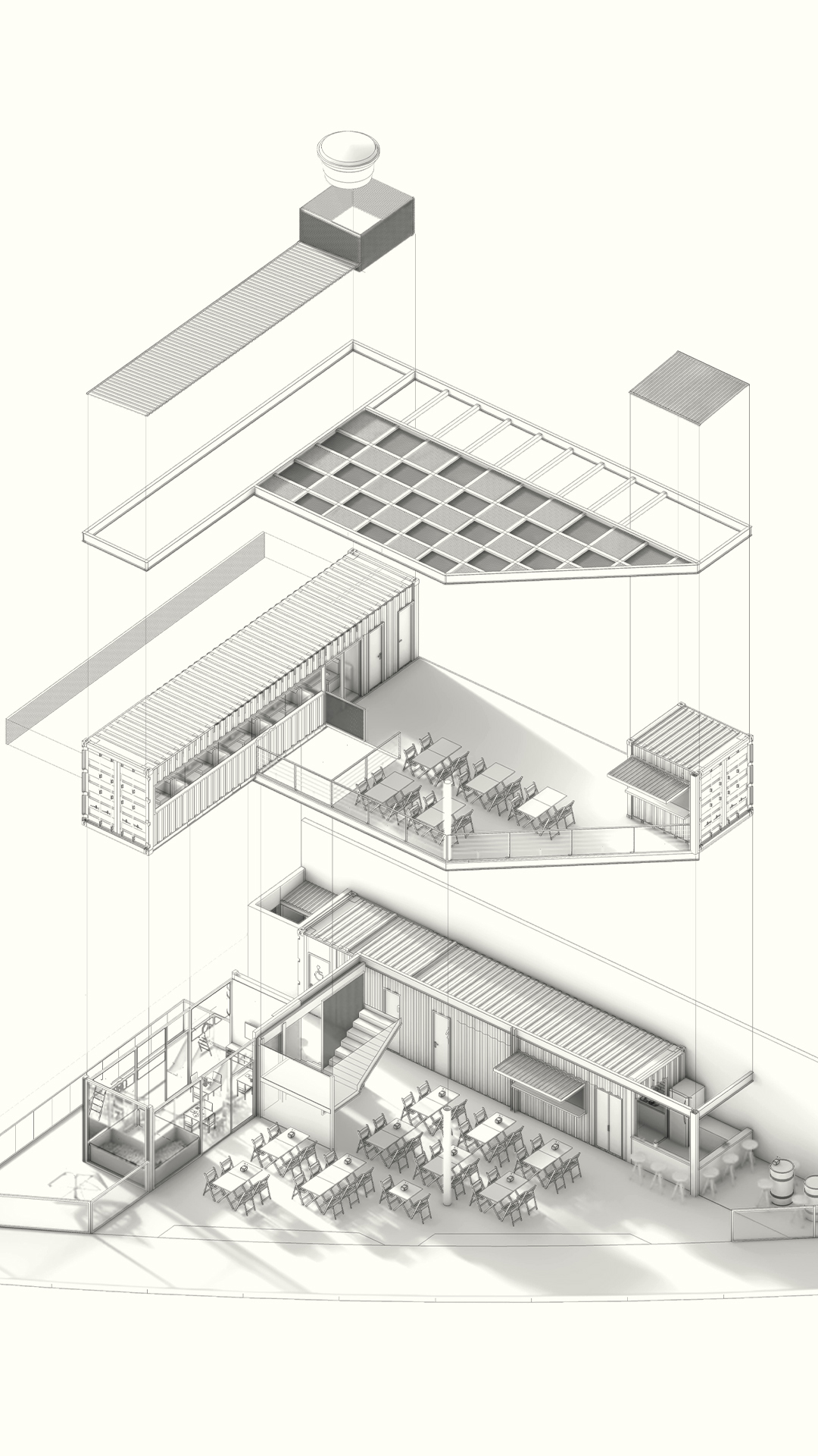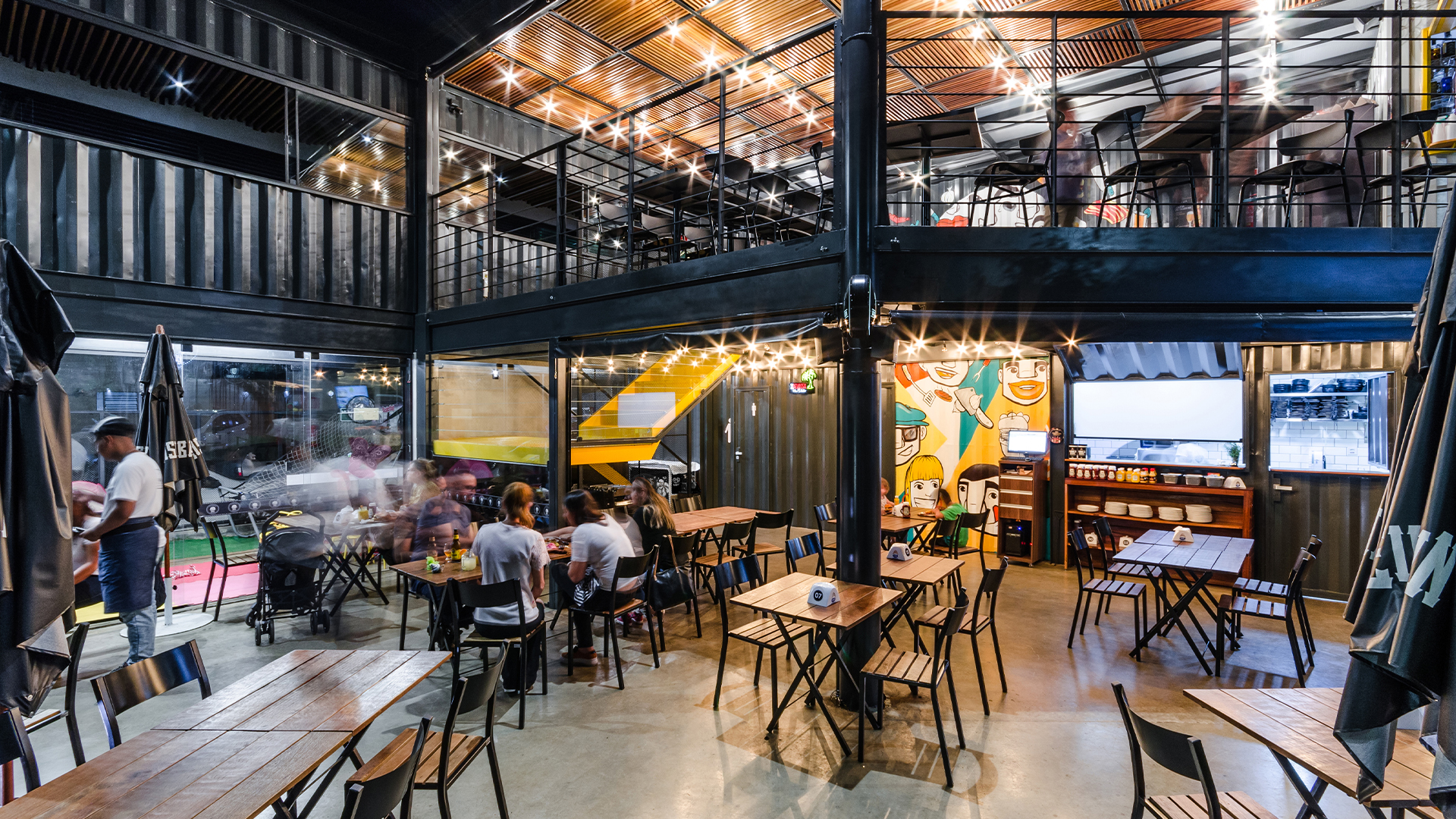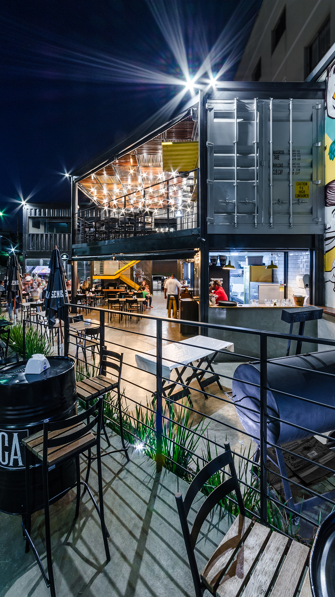 O projeto é composto por dois containers de 40 pés sobrepostos perpendicularmente. A conexão entre os dois volumes é feita através da utilização de uma laje em steel deck. Tal composição cria os espaços cobertos destinados a ocupação das mesas do restaurante. O volume inferior é reservado às instalações de serviço do empreendimento, tais como bar, cozinha, instalações sanitárias e áreas técnicas. Já o pavimento superior contém o segundo container de 40 pés que abriga um espaço reservado para mesas e dois banheiros, além da presença de um container de 10 pés em que foi locado um bar de apoio. Sob o container superior principal está localizado o espaço destinado às crianças.