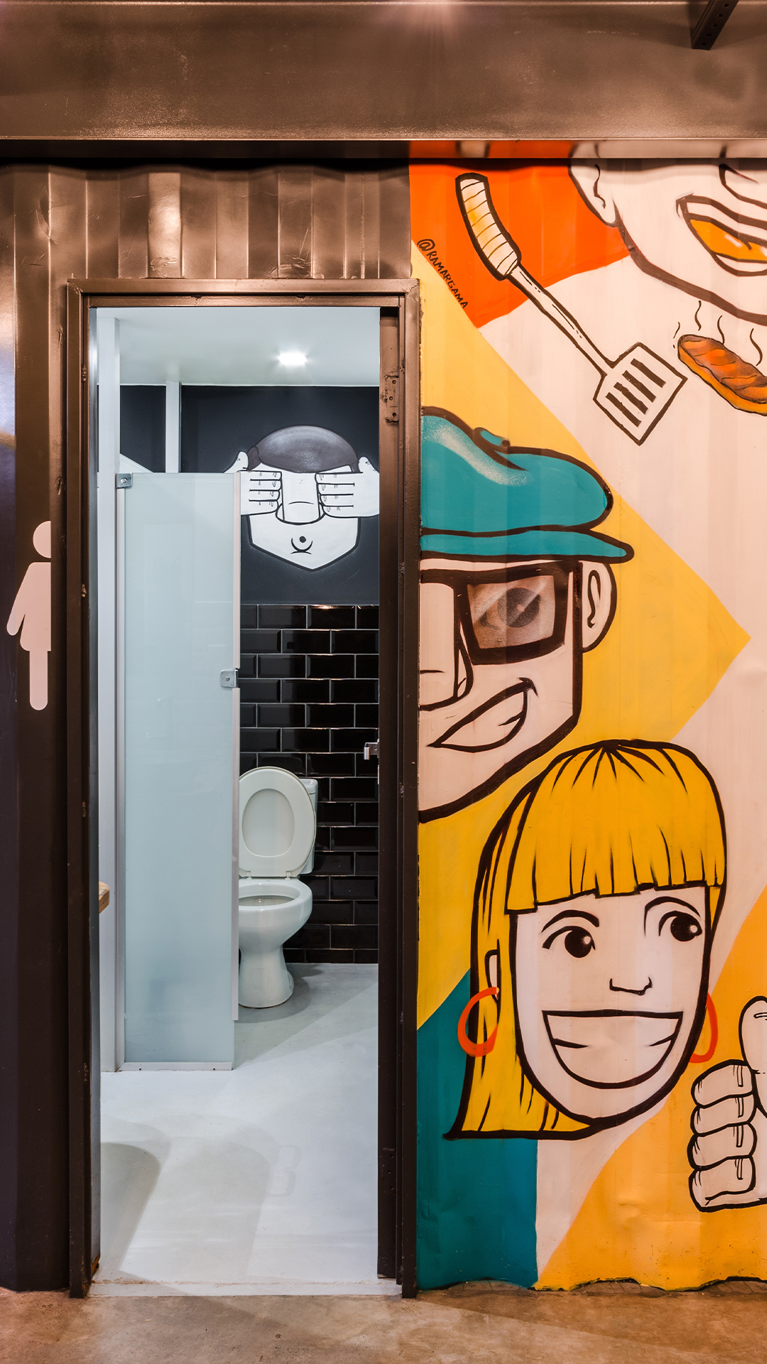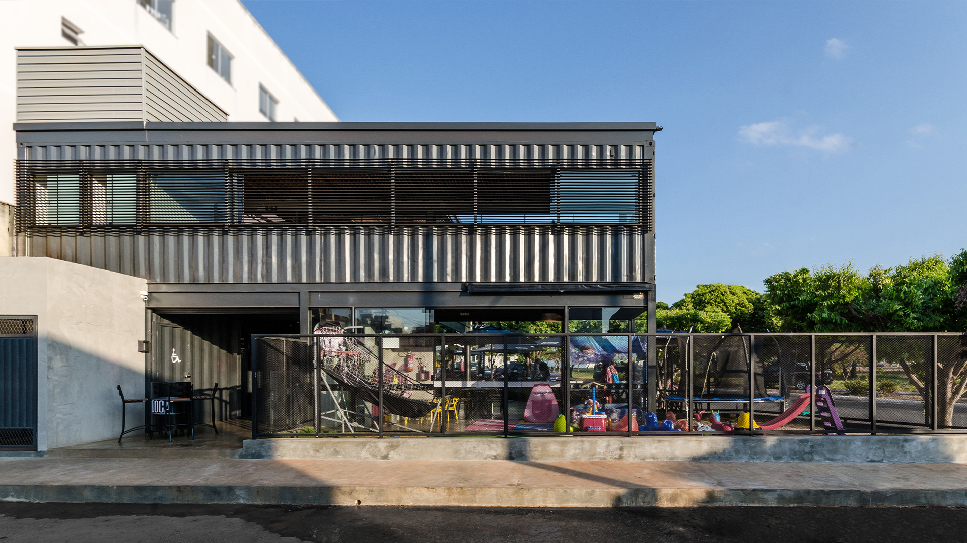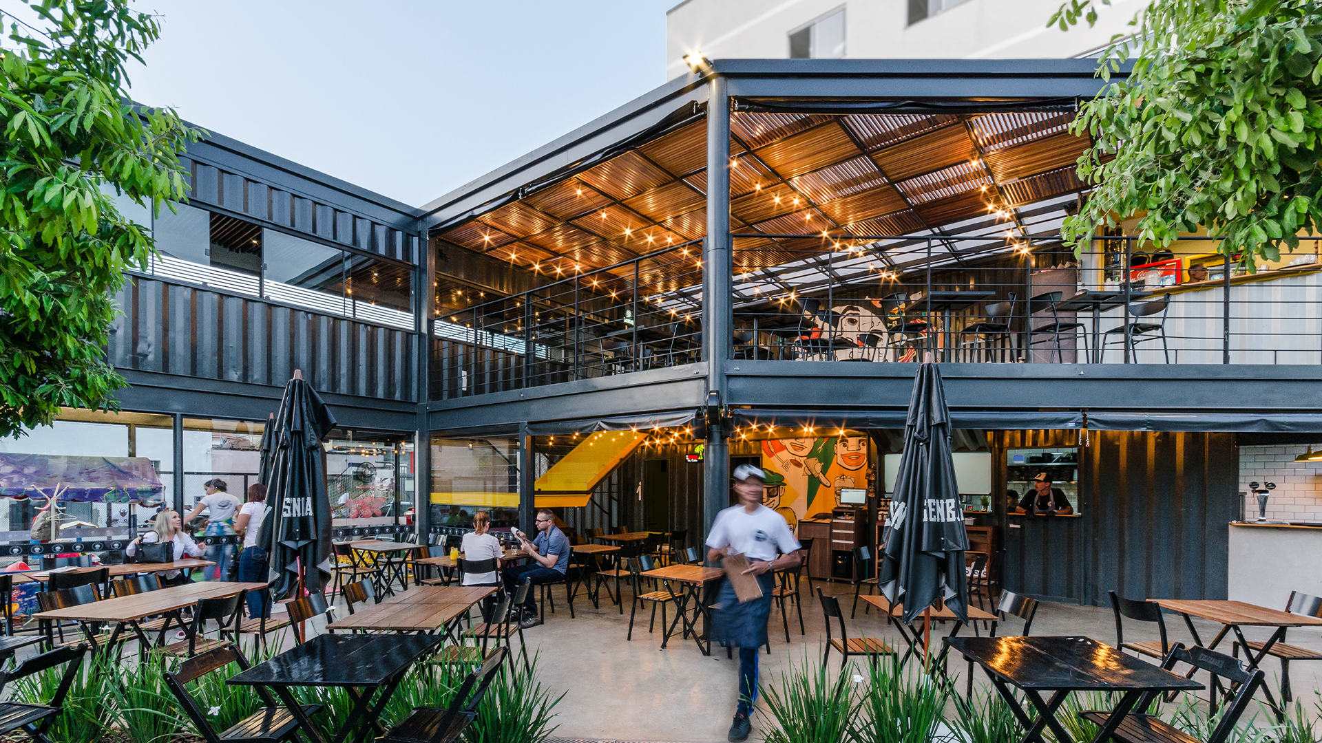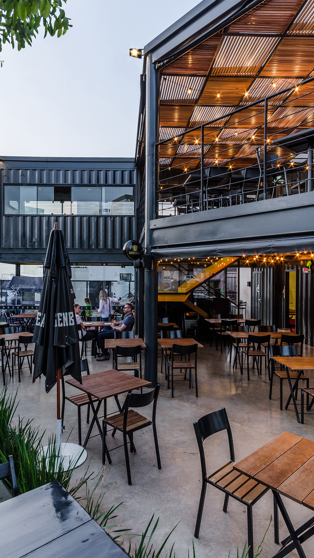 O projeto é composto por dois containers de 40 pés sobrepostos perpendicularmente. A conexão entre os dois volumes é feita através da utilização de uma laje em steel deck. Tal composição cria os espaços cobertos destinados a ocupação das mesas do restaurante. O volume inferior é reservado às instalações de serviço do empreendimento, tais como bar, cozinha, instalações sanitárias e áreas técnicas. Já o pavimento superior contém o segundo container de 40 pés que abriga um espaço reservado para mesas e dois banheiros, além da presença de um container de 10 pés em que foi locado um bar de apoio. Sob o container superior principal está localizado o espaço destinado às crianças.