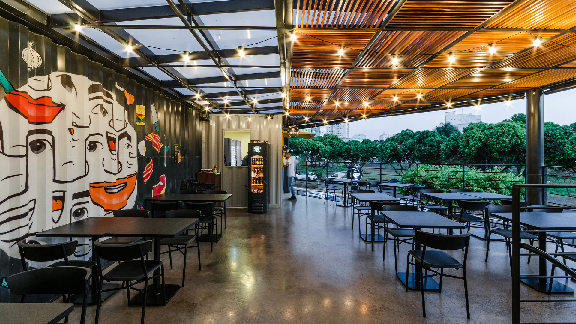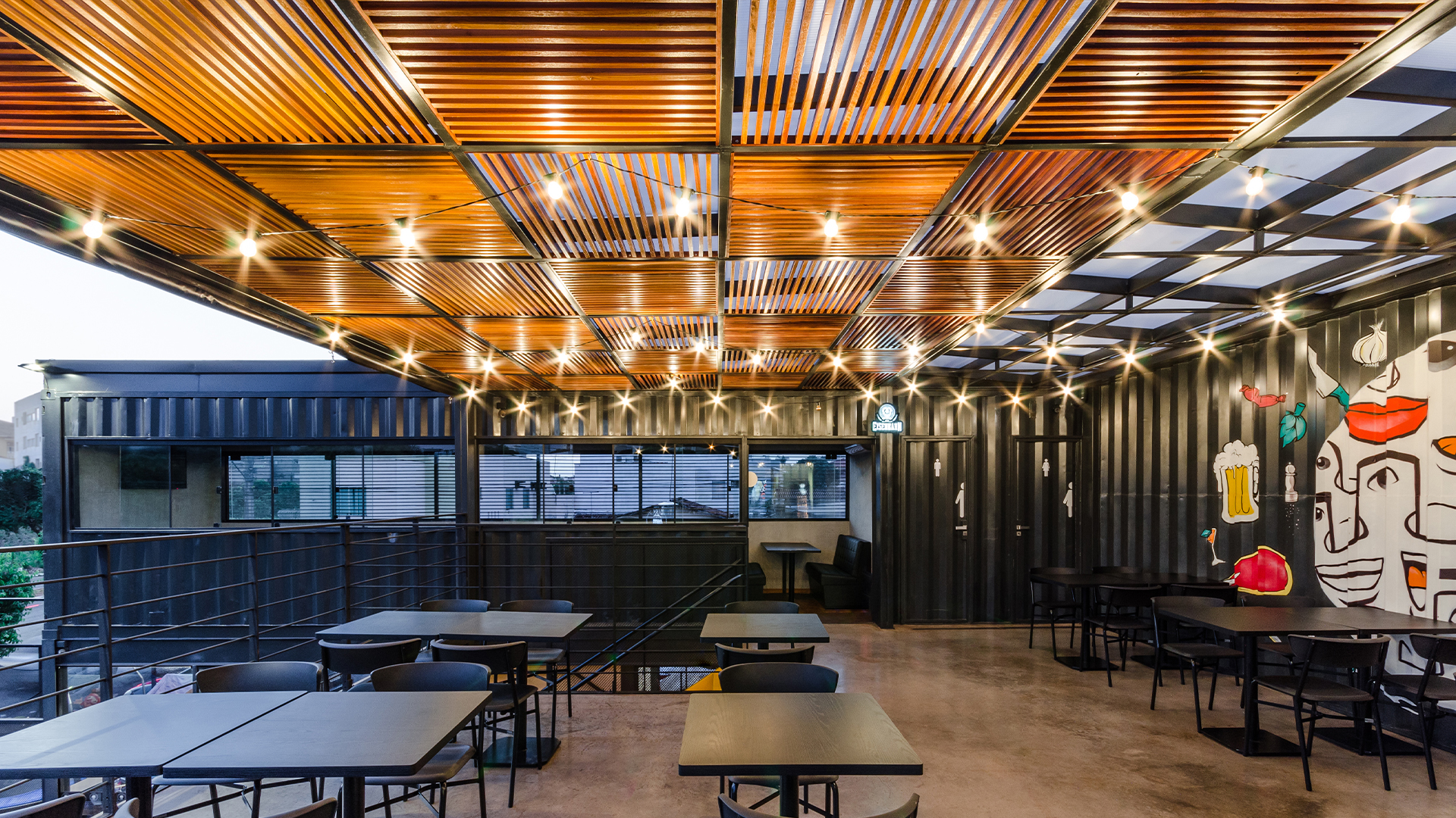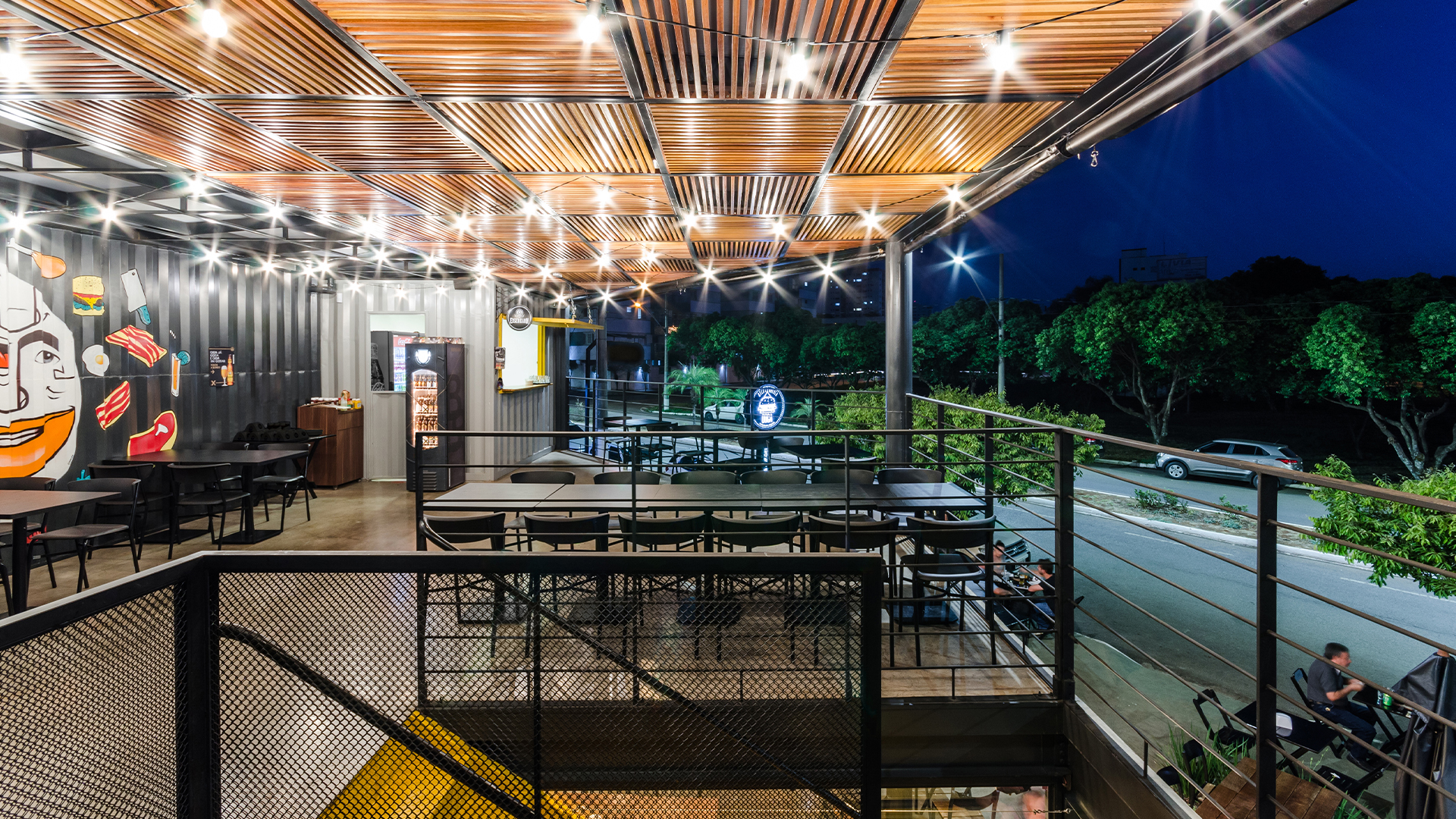 No projeto de interiores, como contraponto ao aspecto frio e industrial do container fizemos uso de materiais que proporcionassem maior aconchego ao usuário e ao mesmo tempo servissem como forma de convite a aproximação do público. Desta forma optamos pela inserção de lâmpadas quentes, utilização de arte urbana disposta em diversos pontos da construção, cores em harmonia e o uso da madeira no pergolado do segundo pavimento.