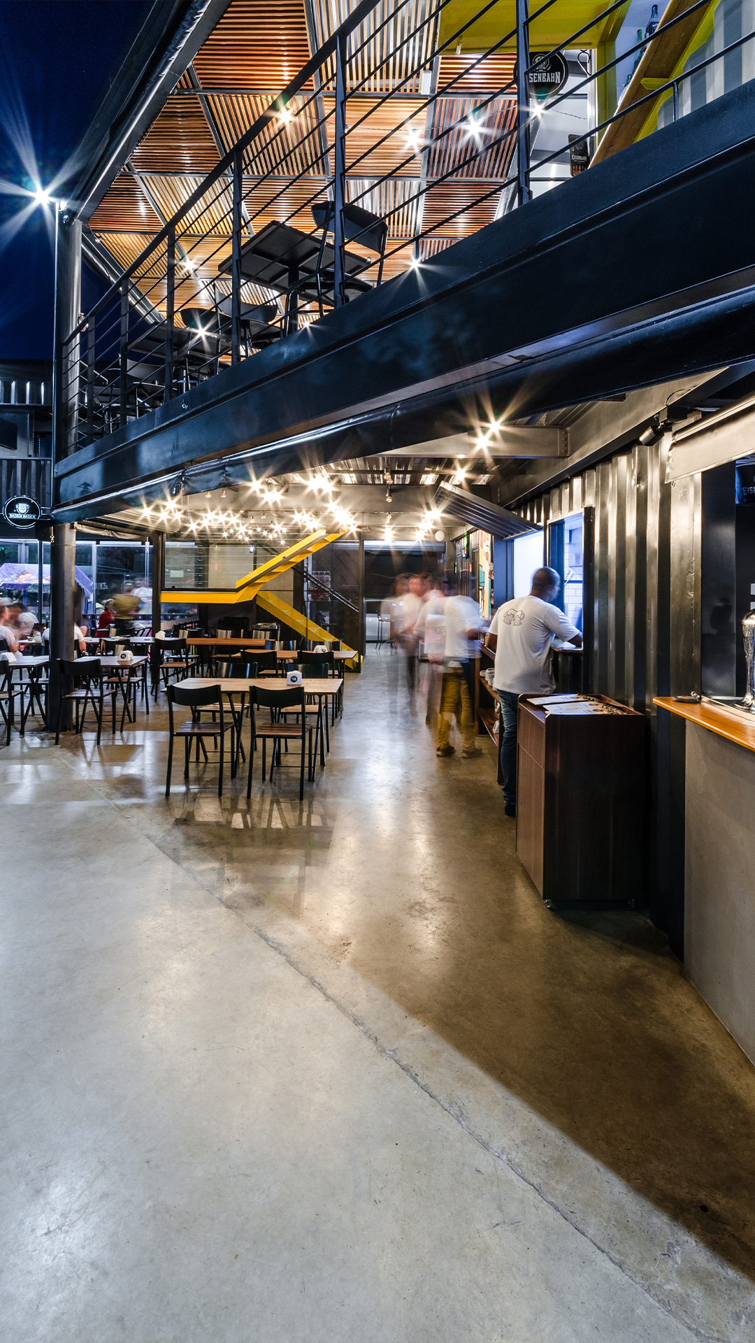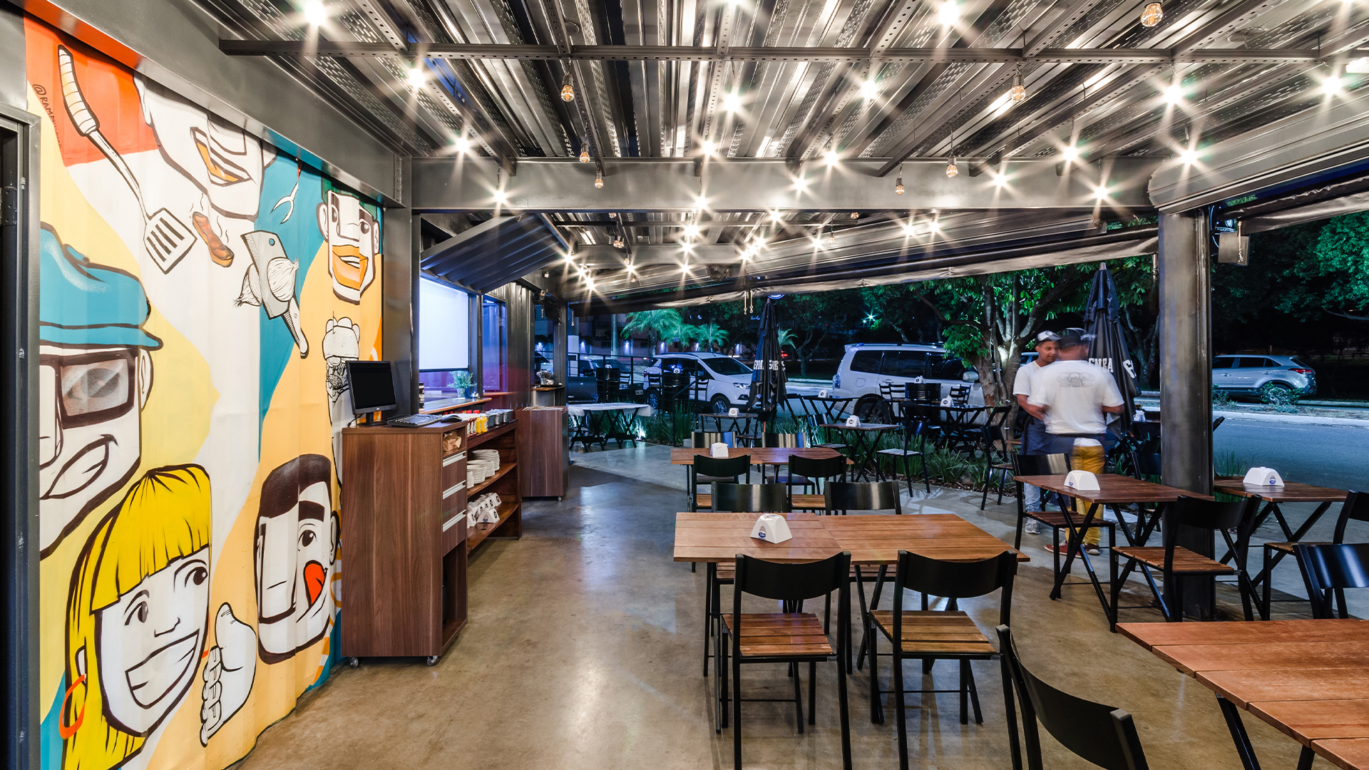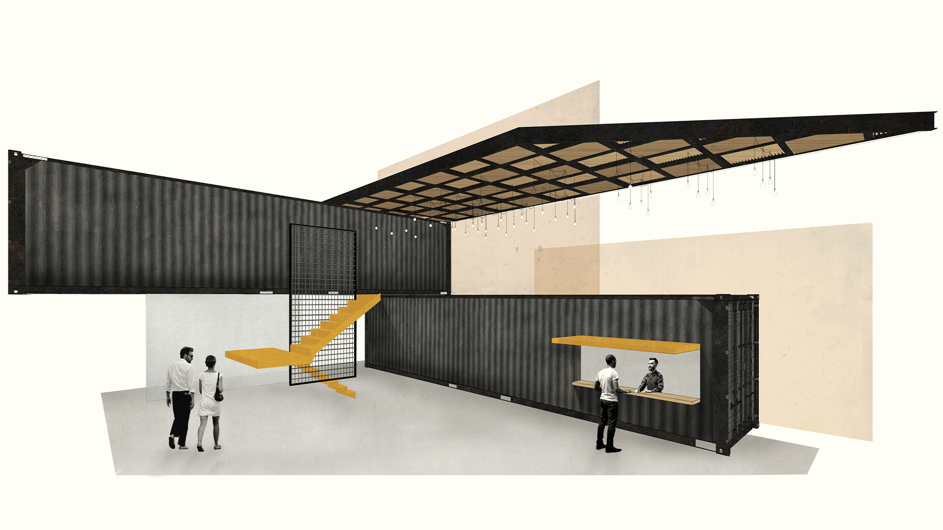 No projeto de interiores, como contraponto ao aspecto frio e industrial do container fizemos uso de materiais que proporcionassem maior aconchego ao usuário e ao mesmo tempo servissem como forma de convite a aproximação do público. Desta forma optamos pela inserção de lâmpadas quentes, utilização de arte urbana disposta em diversos pontos da construção, cores em harmonia e o uso da madeira no pergolado do segundo pavimento.