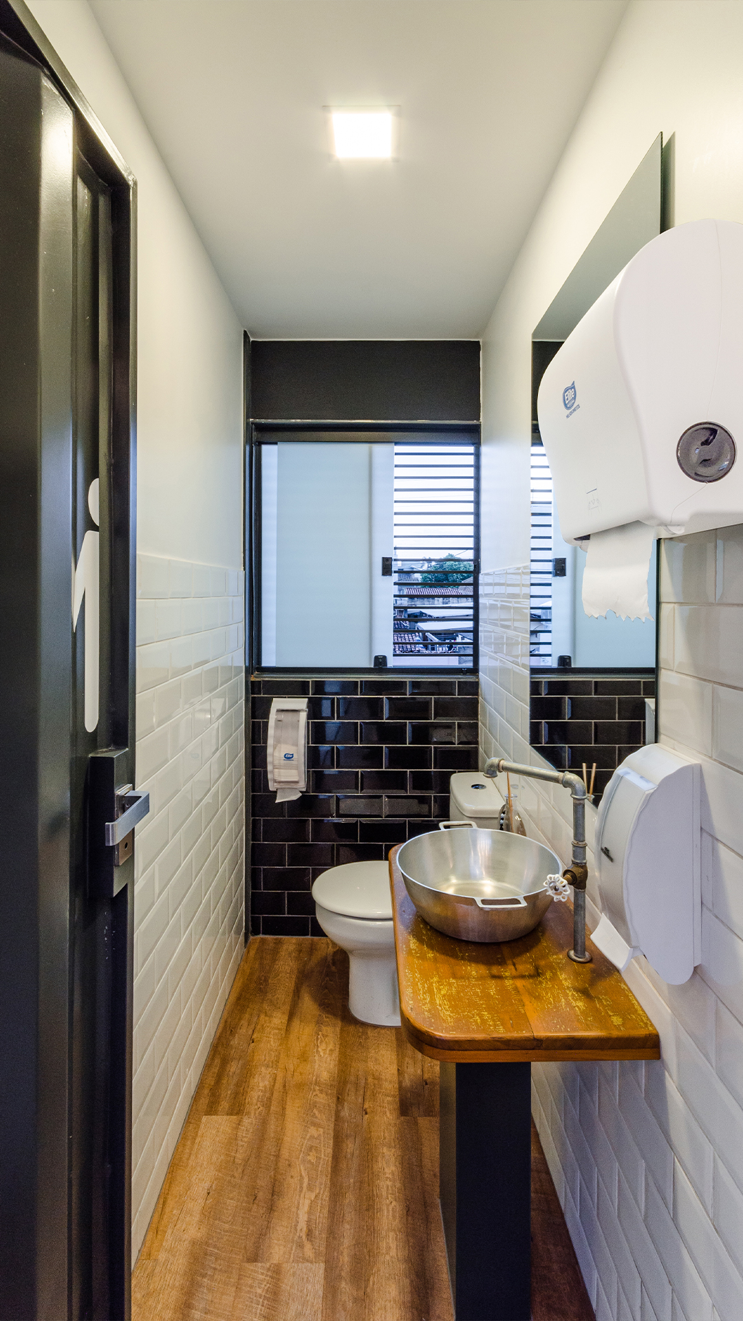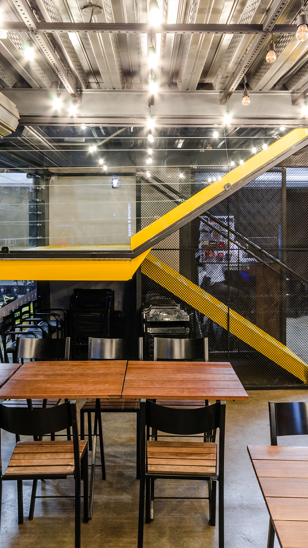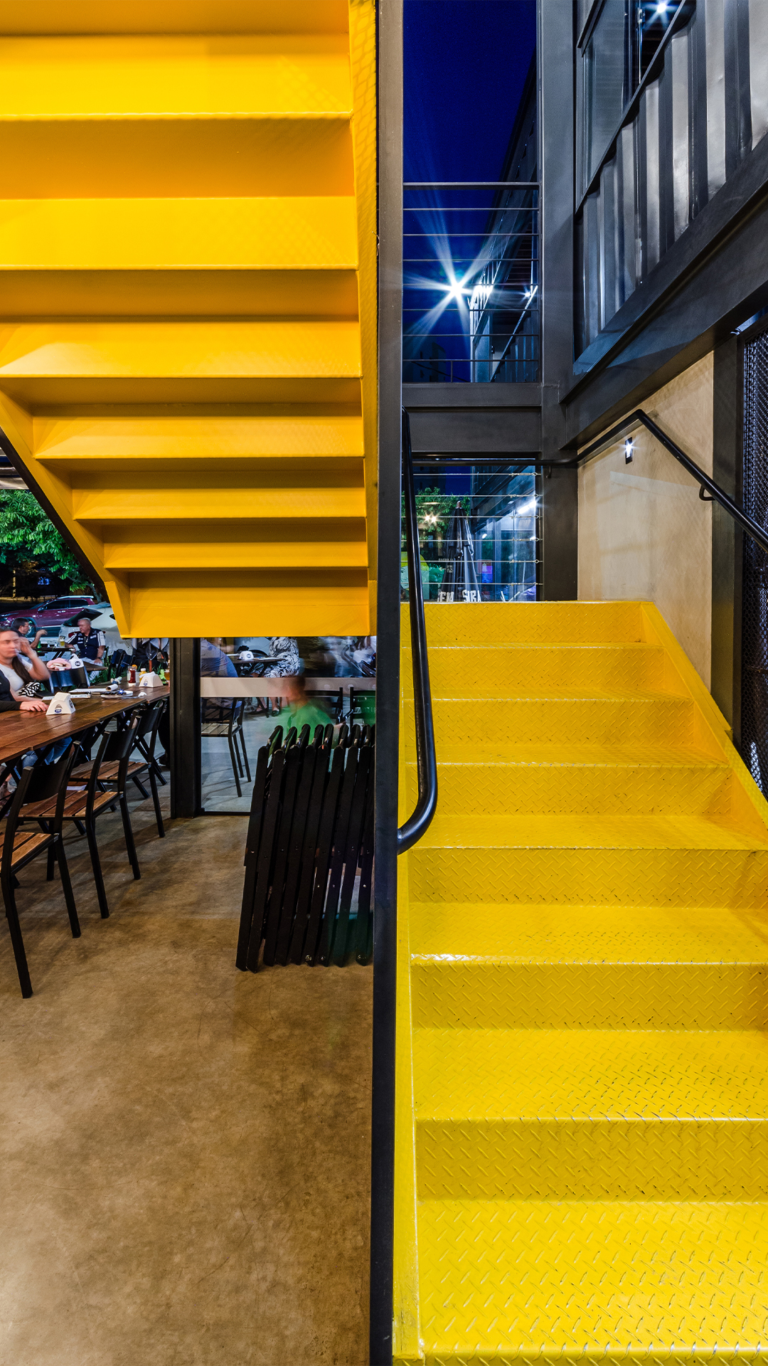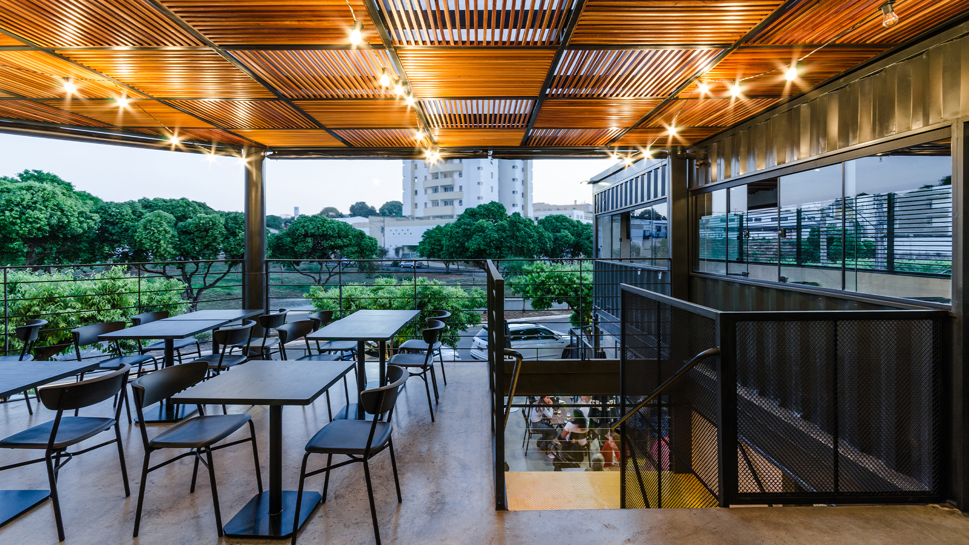 As mesas estão dispostas nos dois pavimentos da edificação. No pavimento térreo elas ocupam toda a projeção terreno, sendo inseridas sob a laje do segundo pavimento, na área descoberta e também na calçada tornando a transição entre exterior e interior mais fluída. Já no pavimento superior elas estão localizadas na parte interior do container e na grande varanda coberta, que se abre para o entorno através do contato visual com a rua e a praça pública existente nos arredores da edificação.